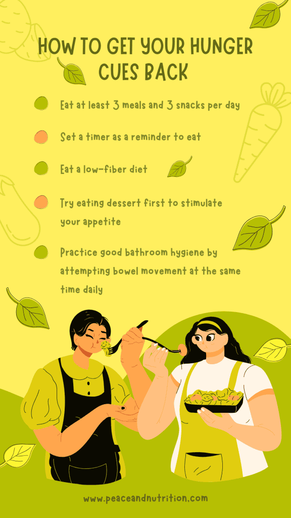 Hunger cues are helpful, but they’re not necessary to eat. In fact, the only way to get your hunger cues back Is to eat. While it might seem counterintuitive, eating when you’re not hungry is the name of the game for both recovering from your eating disorder and getting your hunger cues back.